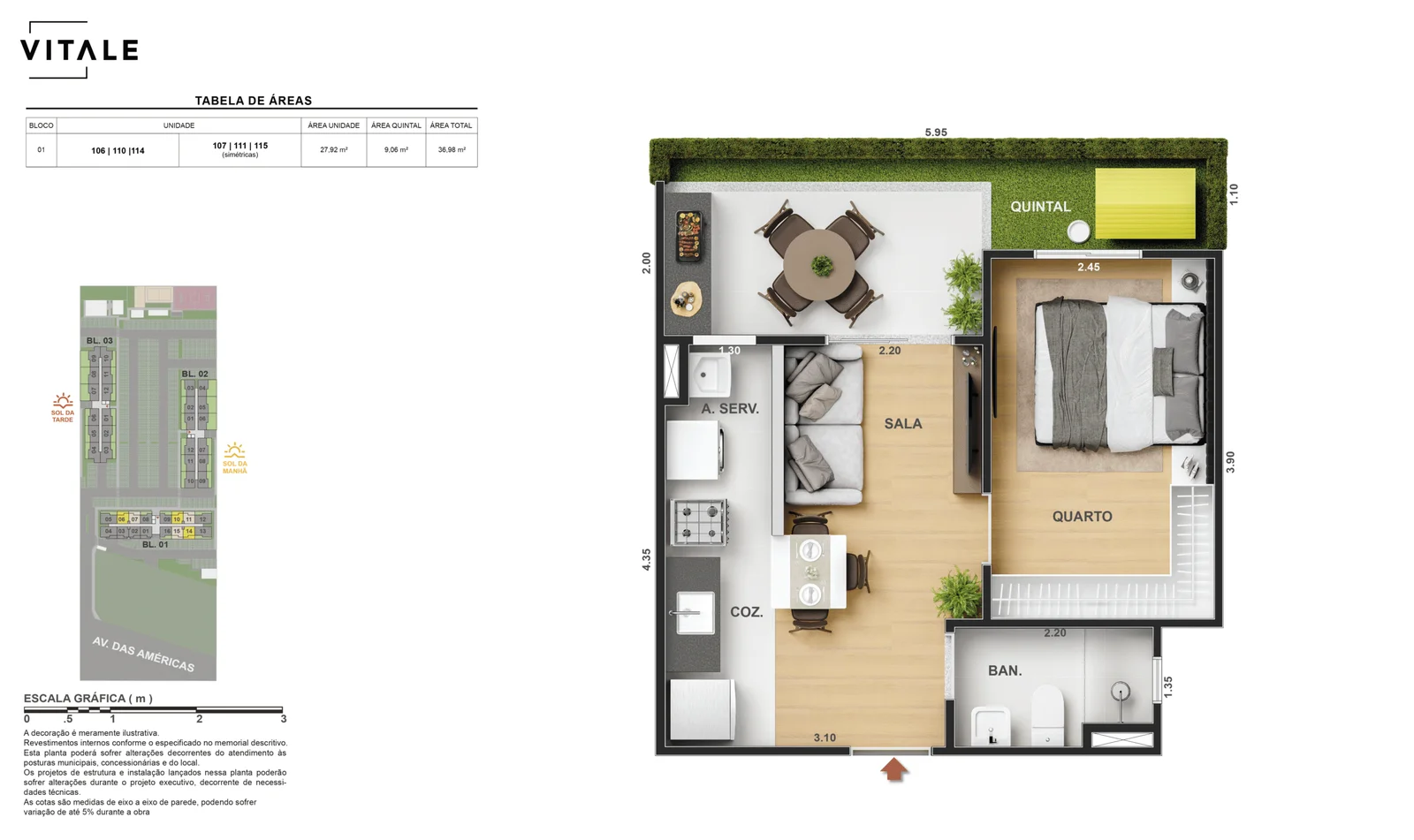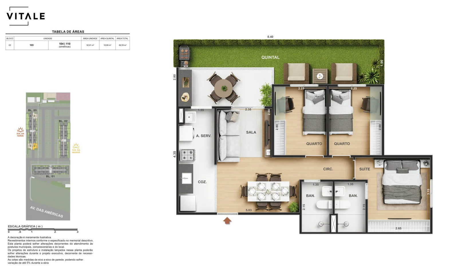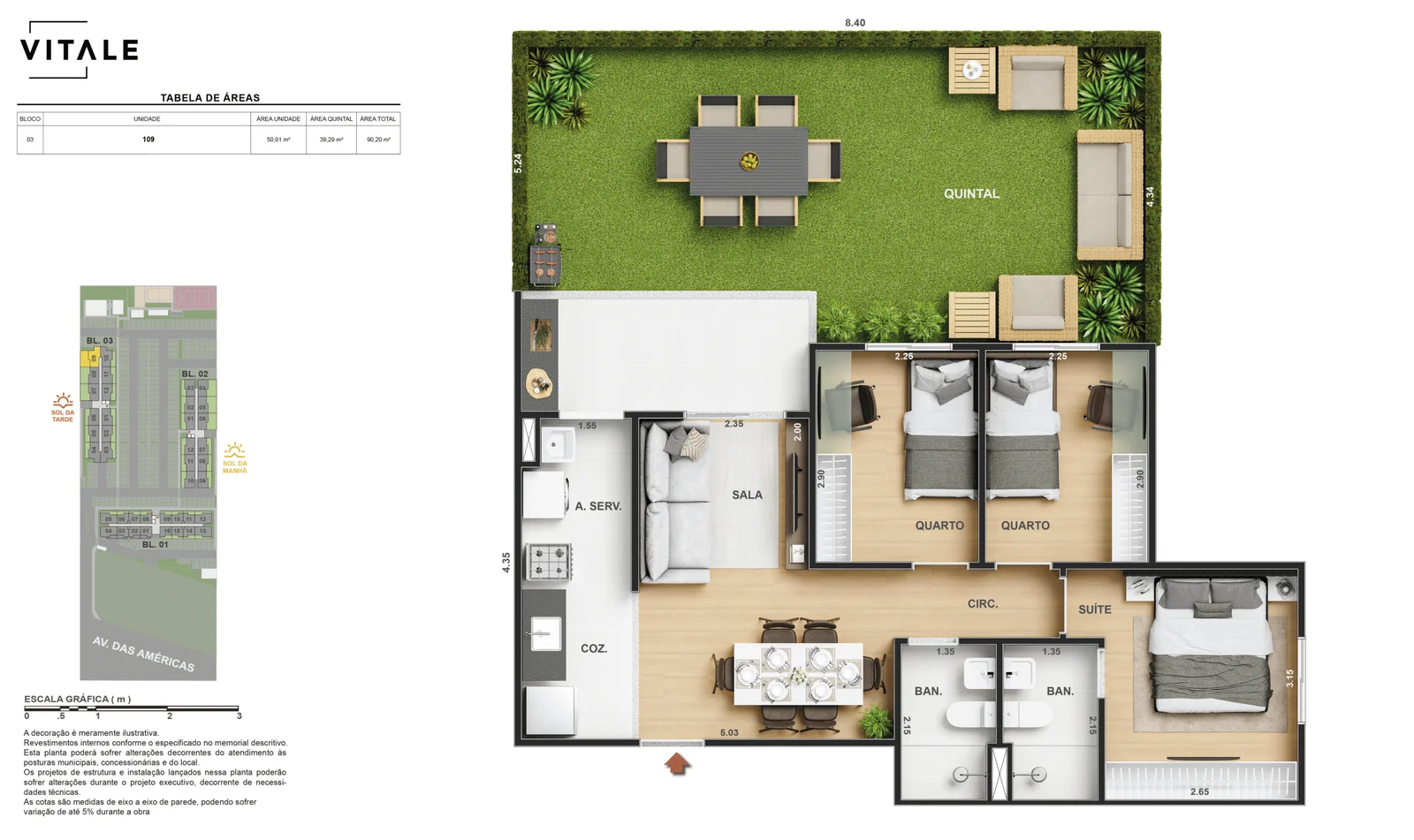 Todas as perspectivas, ilustrações e plantas contidas neste material foram concebidas como uma idealização artística de seus executores, de forma que ilustrem como pretendem que venha a ser o empreendimento em seu todo. O imóvel será construído com fiel observância das plantas aprovadas, das especificações e do memorial descritivo que integram o memorial de incorporação, podendo a PROMITENTE VENDEDORA, no entanto, por conveniência técnica, determinação do Poder Público ou exigência das empresas concessionárias de serviços públicos e Caixa Econômica Federal, promover modificações no projeto aprovado, sem que assista a qualquer das partes direito à indenização ou compensação de qualquer natureza. O paisagismo especificado nas ilustrações artísticas dos materiais publicitários é meramente enunciativo, de modo que o mesmo será executado com “mudas”, cabendo ao condomínio a responsabilidade de manter e zelar para que o referido paisagismo atinja ou se aproxime do nível sugerido no material exibido. As imagens, mobiliários, equipamentos e acabamentos são de caráter ilustrativo e não integram o contrato de compra e venda. As áreas poderão sofrer ajustes em razão de exigências técnicas ou legais, dentro das tolerâncias previstas pelas normas da ABNT. Projeto de construção aprovado pela Prefeitura Municipal da cidade do Rio de Janeiro, através do processo nº EISPRO2024/21600. Arquiteta responsável pelo Projeto: VIRGINIA LANNES EMANUEL CAU/RJ A4301-0. Engenheiro responsável pela Obra: CARLOS EDUARDO FÉLIX PAIVA CREA/RJ 2003103537. Propriedade de VITALE V20 EMPREENDIMENTOS