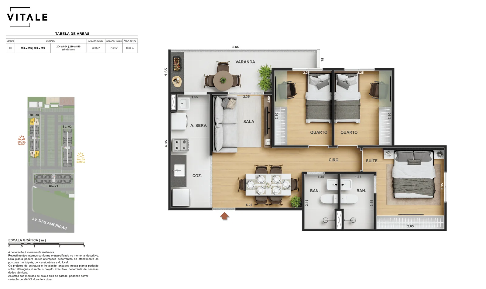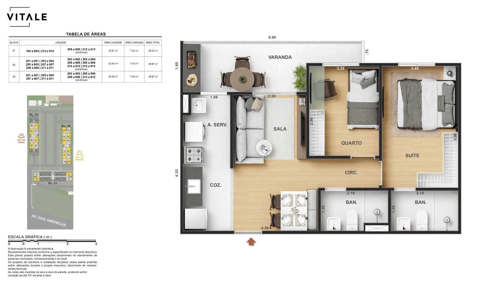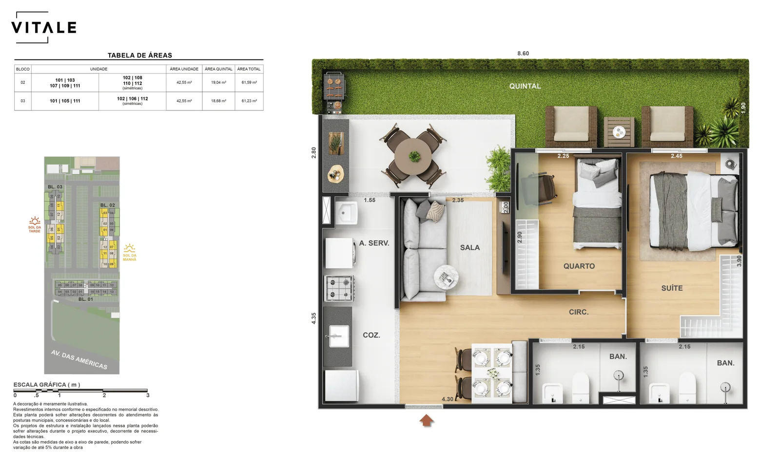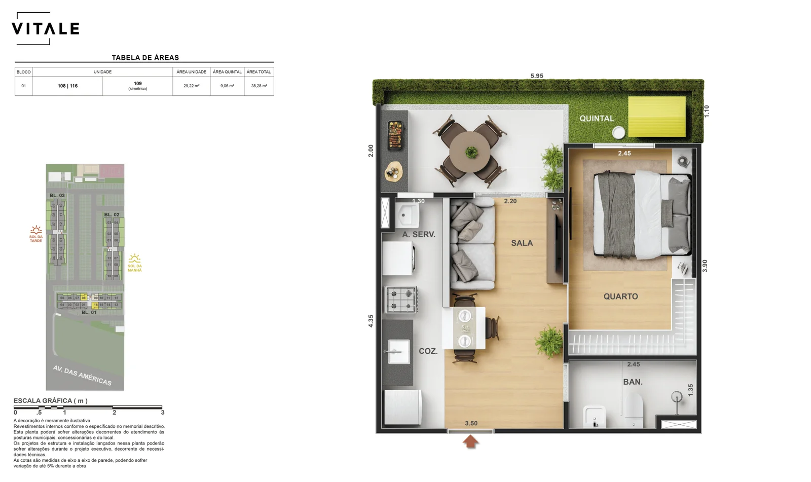 Todas as perspectivas, ilustrações e plantas contidas neste material foram concebidas como uma idealização artística de seus executores, de forma que ilustrem como pretendem que venha a ser o empreendimento em seu todo. O imóvel será construído com fiel observância das plantas aprovadas, das especificações e do memorial descritivo que integram o memorial de incorporação, podendo a PROMITENTE VENDEDORA, no entanto, por conveniência técnica, determinação do Poder Público ou exigência das empresas concessionárias de serviços públicos e Caixa Econômica Federal, promover modificações no projeto aprovado, sem que assista a qualquer das partes direito à indenização ou compensação de qualquer natureza. O paisagismo especificado nas ilustrações artísticas dos materiais publicitários é meramente enunciativo, de modo que o mesmo será executado com “mudas”, cabendo ao condomínio a responsabilidade de manter e zelar para que o referido paisagismo atinja ou se aproxime do nível sugerido no material exibido. As imagens, mobiliários, equipamentos e acabamentos são de caráter ilustrativo e não integram o contrato de compra e venda. As áreas poderão sofrer ajustes em razão de exigências técnicas ou legais, dentro das tolerâncias previstas pelas normas da ABNT. Projeto de construção aprovado pela Prefeitura Municipal da cidade do Rio de Janeiro, através do processo nº EISPRO2024/21600. Arquiteta responsável pelo Projeto: VIRGINIA LANNES EMANUEL CAU/RJ A4301-0. Engenheiro responsável pela Obra: CARLOS EDUARDO FÉLIX PAIVA CREA/RJ 2003103537. Propriedade de VITALE V20 EMPREENDIMENTOS