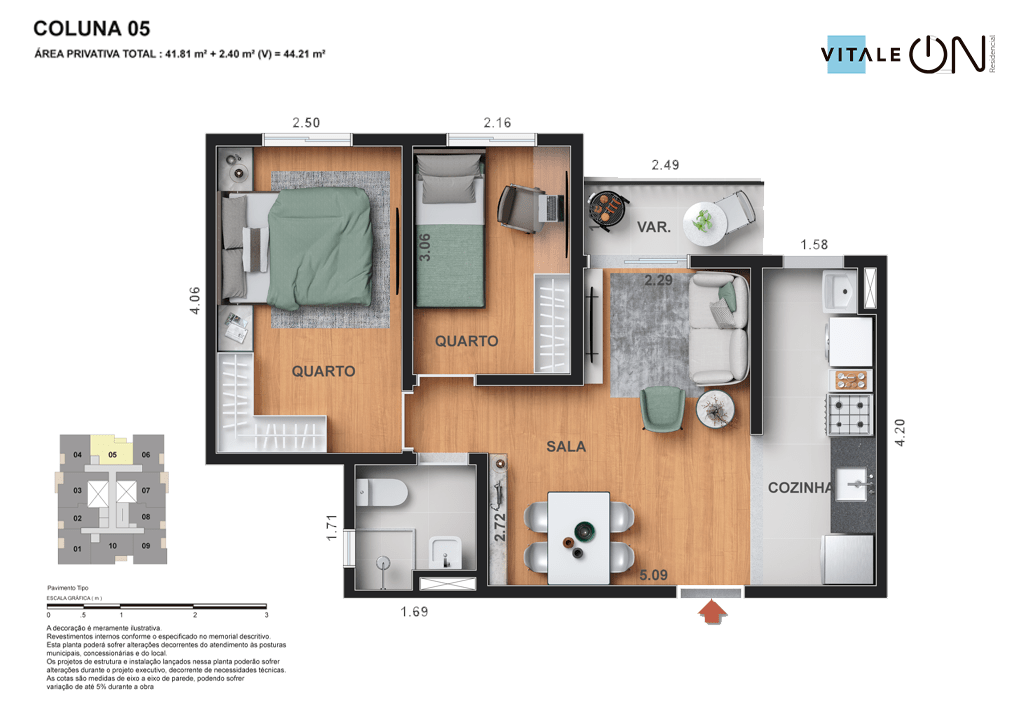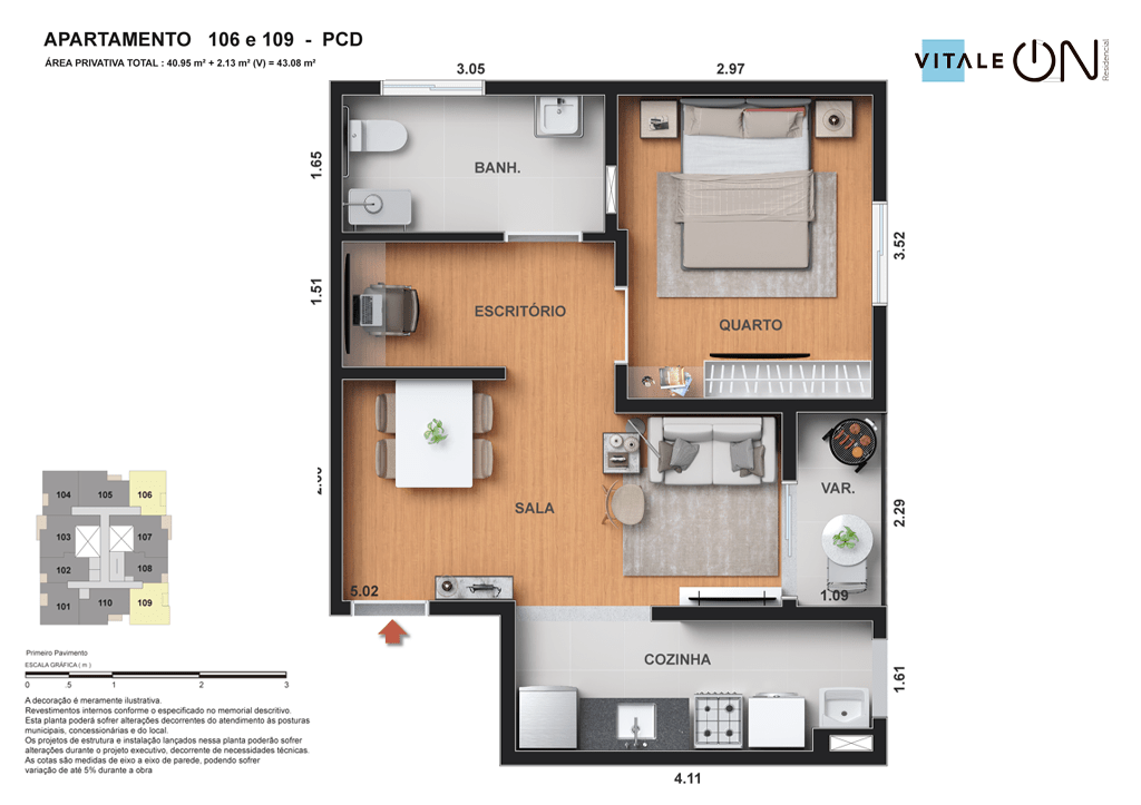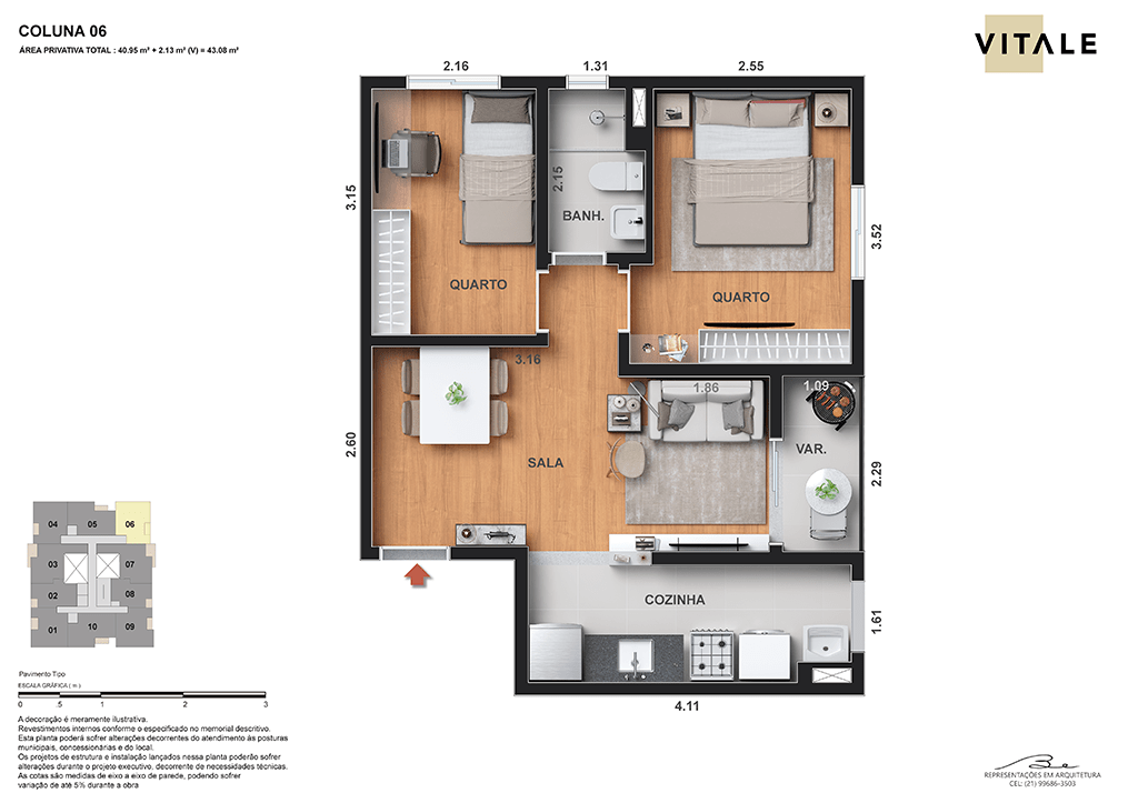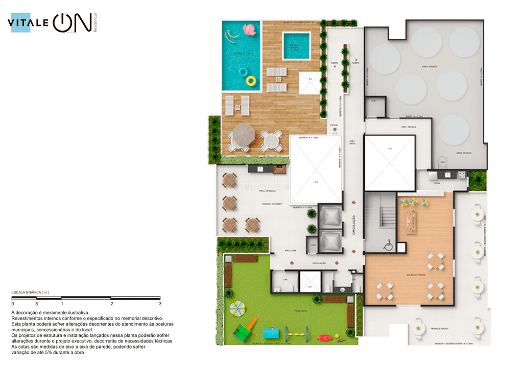 Todas as perspectivas, ilustrações e plantas contidas neste material foram concebidas como uma idealização artística de seus executores, de forma que ilustrem como pretendem que venha a ser o empreendimento em seu todo. O imóvel será construído com fiel observância das plantas aprovadas, das especificações e do memorial descritivo que integram o memorial de incorporação, podendo a PROMITENTE VENDEDORA, no entanto, por conveniência técnica, determinação do Poder Público ou exigência das empresas concessionárias de serviços públicos e Caixa Econômica Federal, promover modificações no projeto aprovado, sem que assista a qualquer das partes direito à indenização ou compensação. O paisagismo especificado nas ilustrações artísticas dos materiais publicitários é meramente enunciativo, de modo que o mesmo será executado com “mudas”, cabendo ao condomínio a responsabilidade de manter e zelar para que o referido paisagismo atinja ou se aproxime do nível sugerido no material exibido. O benefício do Programa Minha Casa, Minha Vida está de acordo com a Medida Provisória nº 1.162/2023. O financiamento no banco será concedido mediante análise prévia, pelo agente financiador, da documentação do comprador. É de responsabilidade exclusiva do comprador preencher as condições exigidas pelo agente financiador para concessão de empréstimo imobiliário. Arquiteta responsável pelo projeto: Virgínia Lannes Emanuel – CAU A4301-0. Engenheiro responsável pela obra: Carlos Eduardo Felix Paiva – CREA/RJ: 2003103537. Propriedade de VITALE V11 EMPREENDIMENTOS IMOBILIÁRIOS LTDA