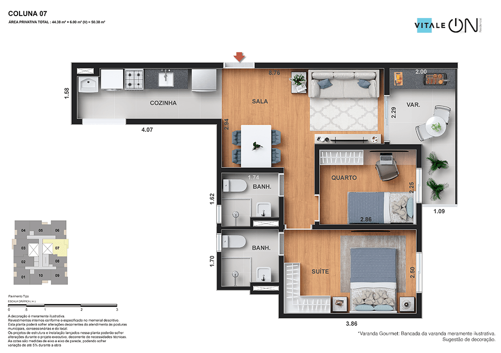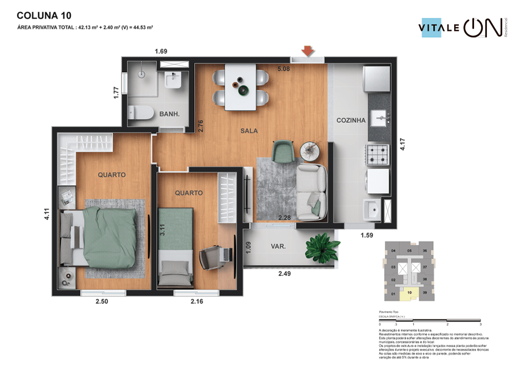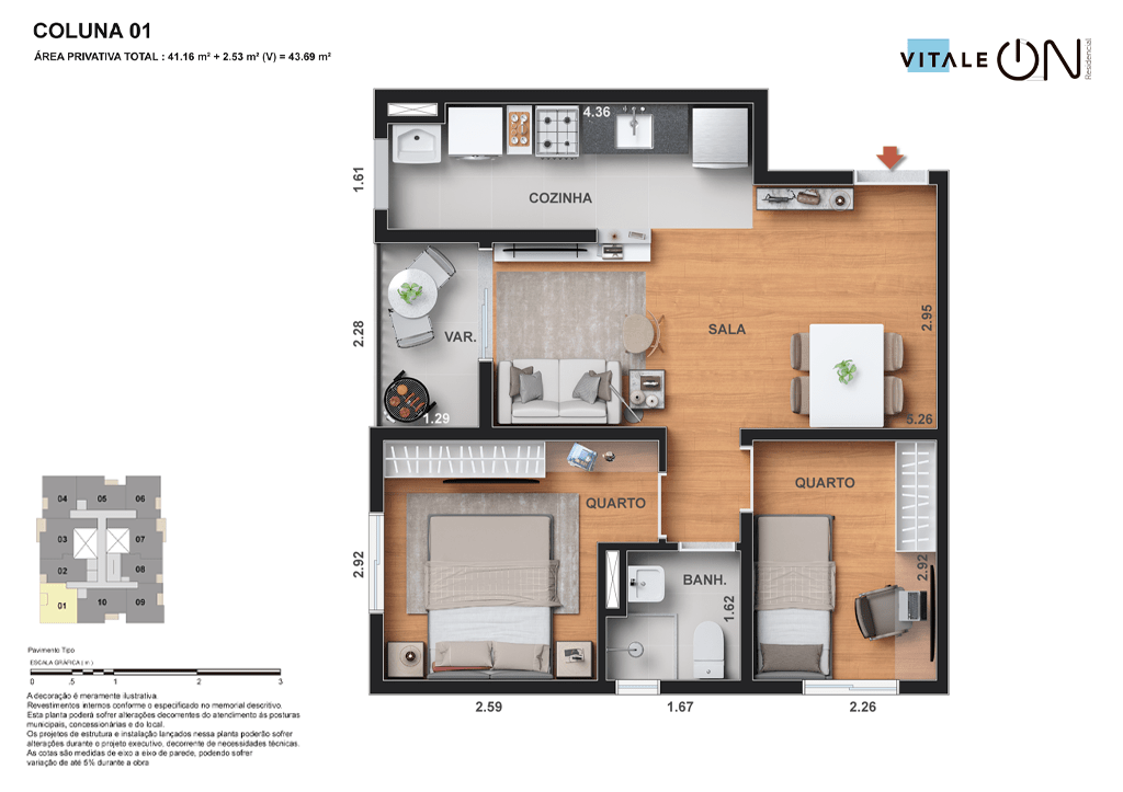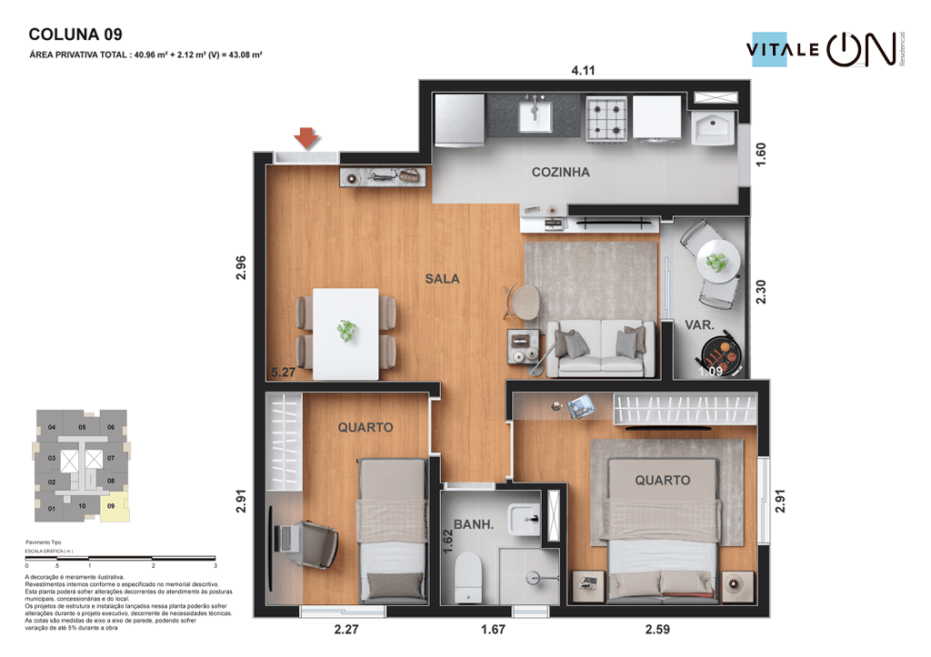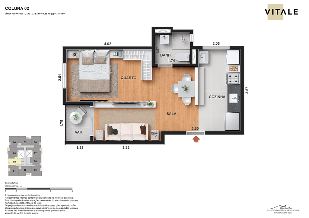 Todas as perspectivas, ilustrações e plantas contidas neste material foram concebidas como uma idealização artística de seus executores, de forma que ilustrem como pretendem que venha a ser o empreendimento em seu todo. O imóvel será construído com fiel observância das plantas aprovadas, das especificações e do memorial descritivo que integram o memorial de incorporação, podendo a PROMITENTE VENDEDORA, no entanto, por conveniência técnica, determinação do Poder Público ou exigência das empresas concessionárias de serviços públicos e Caixa Econômica Federal, promover modificações no projeto aprovado, sem que assista a qualquer das partes direito à indenização ou compensação. O paisagismo especificado nas ilustrações artísticas dos materiais publicitários é meramente enunciativo, de modo que o mesmo será executado com “mudas”, cabendo ao condomínio a responsabilidade de manter e zelar para que o referido paisagismo atinja ou se aproxime do nível sugerido no material exibido. O benefício do Programa Minha Casa, Minha Vida está de acordo com a Medida Provisória nº 1.162/2023. O financiamento no banco será concedido mediante análise prévia, pelo agente financiador, da documentação do comprador. É de responsabilidade exclusiva do comprador preencher as condições exigidas pelo agente financiador para concessão de empréstimo imobiliário. Arquiteta responsável pelo projeto: Virgínia Lannes Emanuel – CAU A4301-0. Engenheiro responsável pela obra: Carlos Eduardo Felix Paiva – CREA/RJ: 2003103537. Propriedade de VITALE V11 EMPREENDIMENTOS IMOBILIÁRIOS LTDA