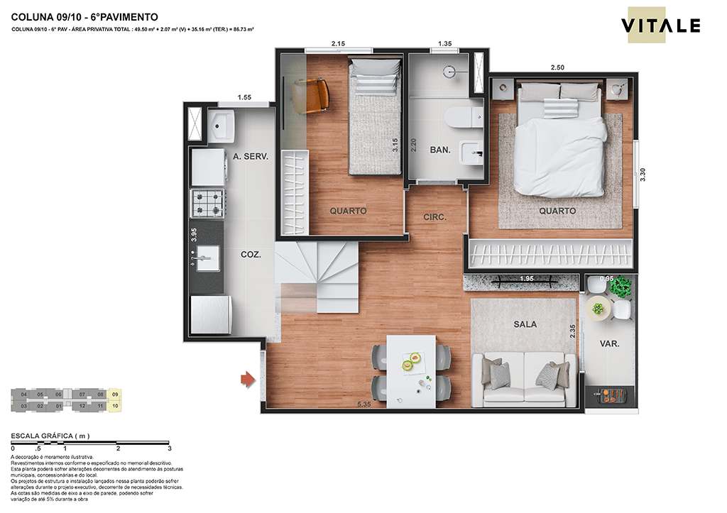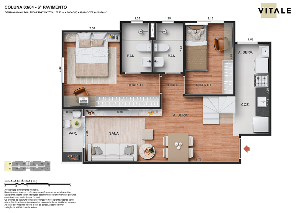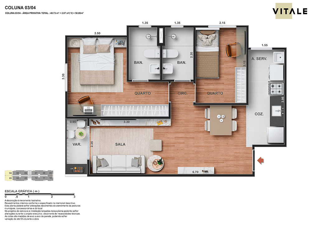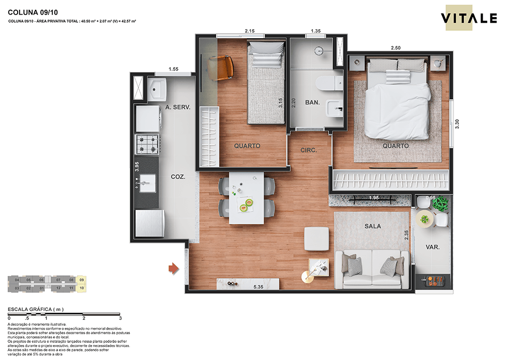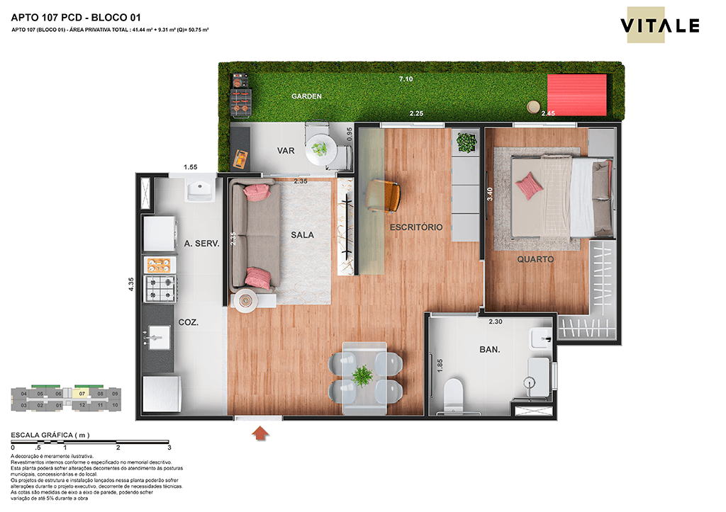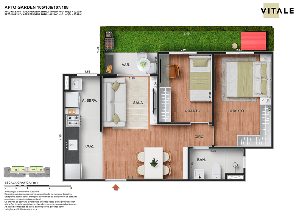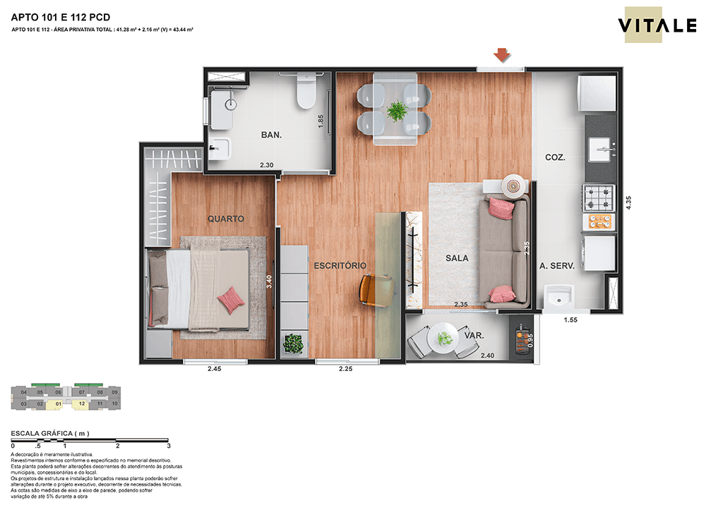 Os apartamentos tipo que constituem o residencial Vitale View, no bairro Camorim, são confortáveis, funcionais e apresentam acabamentos em excelente padrão de qualidade, item que torna o interior do imóvel rico em detalhes. Os imóveis possuem área total interna de 43 m², possibilidade de vaga no estacionamento e suas plantas incluem 2 quartos, sendo que um deles pode ser transformado em um escritório para atividades profissionais ou mesmo para os estudos. Algumas das unidades são adaptadas para PCDs, sendo este um excelente diferencial para garantir o bem-estar dos moradores. Este lançamento residencial é bastante atrativo também para as pessoas que desejam investir em imóveis, pois a região é altamente valorizada, conta com bom atendimento pelo transporte público e possui localização privilegiada no mapa da cidade.
